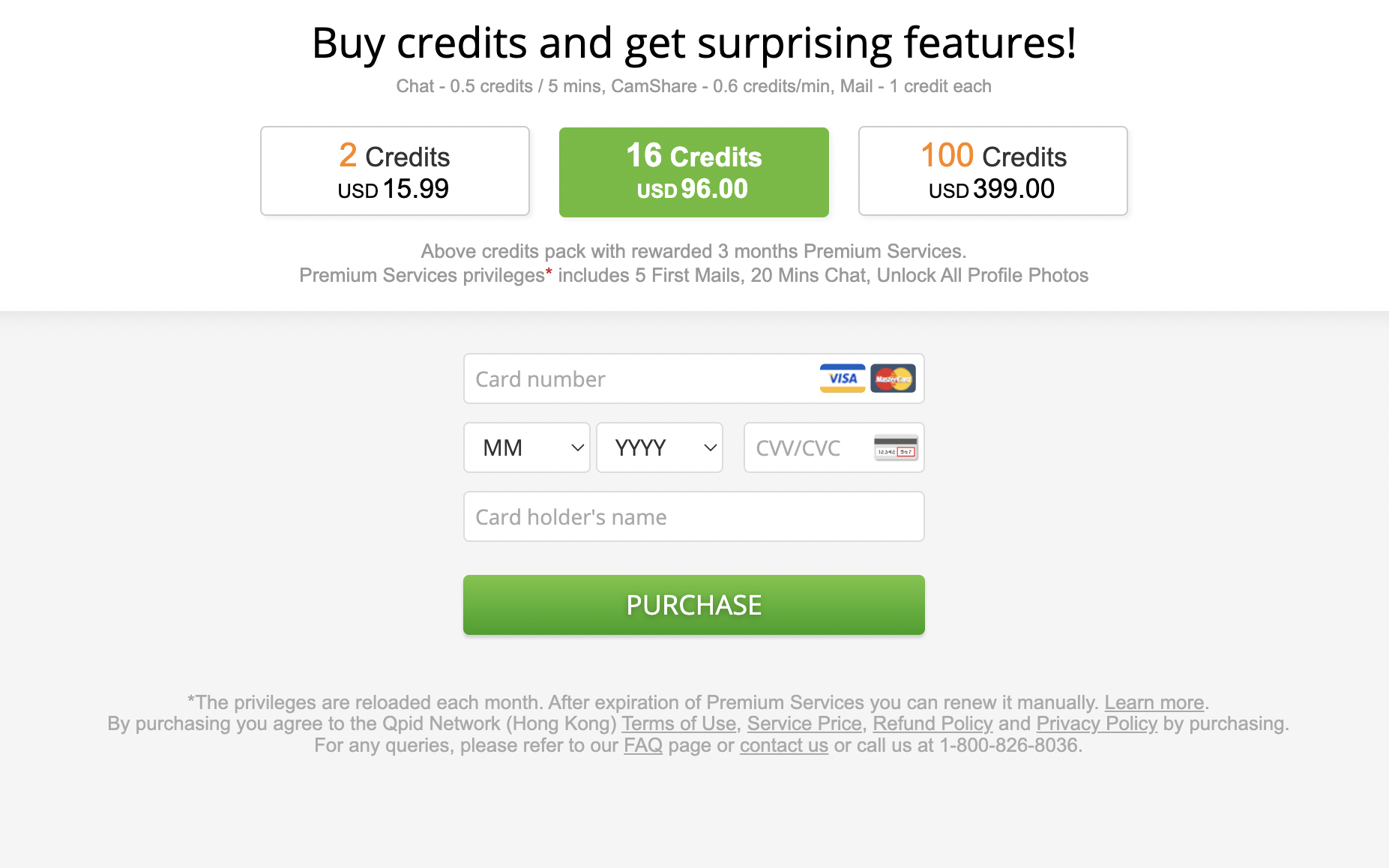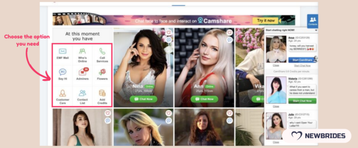 Based on our experience, the best deal is to deposit your account for $399 and get 100 credits. They will be enough for pretty active communication via chats and even video conversations, considering that the price for chat is 0,5 credits per 5 minutes, the CamShare feature is 0,6 credits per minute and one mail will cost you 1 credit.