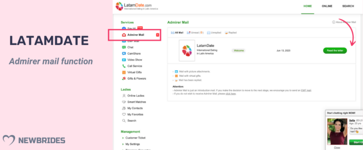 - Admirer Mail. You will receive multiple Admirer mails from different girls and it is up to you which message to respond to. Nevertheless, Admirer Mails provides a great opportunity to meet new acquaintances and choose a Latin lady to your taste.